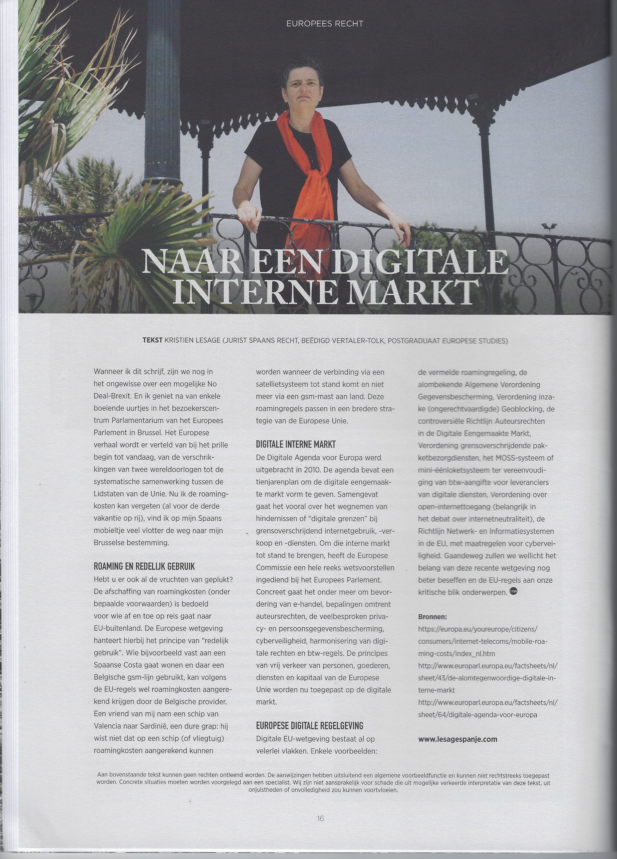 In het herfstnummer van het tijdschrift van Stichting Vlamingen In de Wereld publiceerde ik opnieuw een artikel van de reeks Europees Recht. In het kader van de regelgeving over de digitale interne markt, heb ik het ook over roaming, misschien goed om weten voor de Spanje-fanaat. Een citaat: Hebt u er ook al de vruchten van geplukt? De afschaffing van roamingkosten (onder bepaalde voorwaarden) is bedoeld voor wie af en toe op reis gaat naar EU-buitenland. De Europese wetgeving hanteert hierbij het principe van “redelijk gebruik”. Wie bijvoorbeeld vast aan een Spaanse Costa gaat wonen en daar een Belgische gsm-lijn gebruikt, kan volgens de EU-regels wel roamingkosten aangerekend krijgen door de Belgische provider.